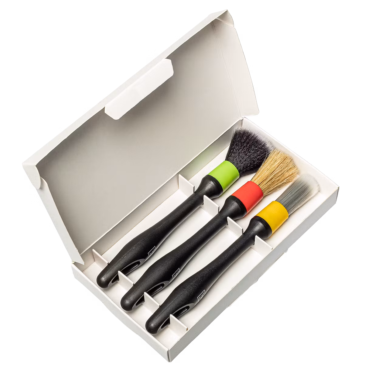 Detta innovativa borstsetet kombinerar den höga kvaliteten på våra inredningsrengöringsprodukter med våra specialutvecklade borstar för inredningsrengöring. Setet består av tre borstar som tack vare sina olika användningsmöjligheter möjliggör enkel rengöring av fordonets interiör. För att underlätta hanteringen är de tre borstarna färgkodade från varandra. Den röda borsten är idealisk för rengöring av tröskelkanter, fotpedaler eller annat grovt arbete. Den gula borsten är det rätta valet för finare arbeten, till exempel rengöring av ventilationsgallret, och briljerar här särskilt tack vare sina finare borst. När det gäller särskilt fint arbete, som rengöring av displayer eller pianolack, arbetar vår gröna borste med den nödvändiga försiktigheten tack vare sina särskilt fina borst och garanterar därmed rengöring utan risk för repor. Särskilt i kombination med våra produkter, till exempel multifunktionsrengöringsmedlet, blir inredningsrengöring en barnlek.
